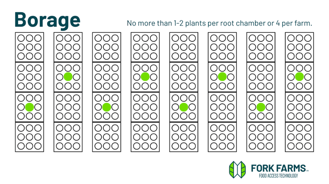 - Borage should be transplanted no more than one to two plants per root chamber (top panel’s center hole and/or the 3rd panel’s center hole). Fork Farms recommends transplanting no more than 4 borage plants per farm, as they are heavy water consumers.