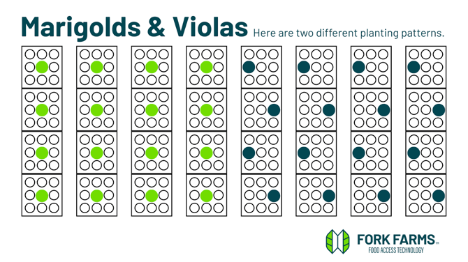 - Fork Farms recommends transplanting one marigold or viola plant per panel, in the center panel hole, to allow for proper spacing.